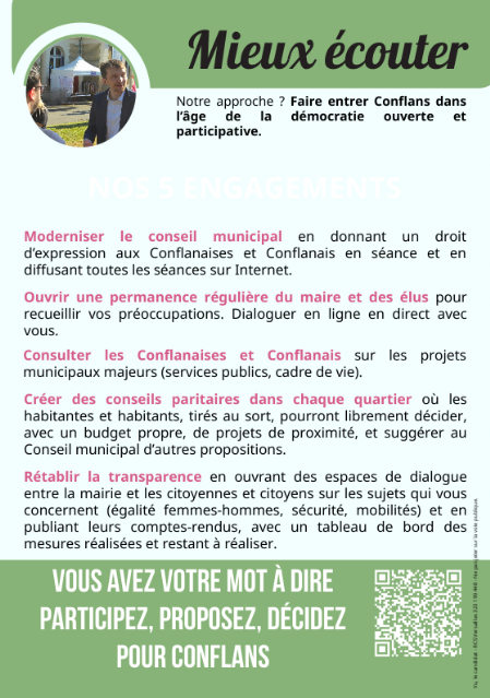 Moderniser le conseil municipal en donnant un droit d’expression aux Conflanaises et Conflanais en séance et en diffusant toutes les séances sur Internet. Ouvrir une permanence régulière du maire et des élus pour recueillir vos préoccupations. Dialoguer en ligne en direct avec vous. Consulter les Conflanaises et Conflanais sur les projets municipaux majeurs (services publics, cadre de vie). Créer des conseils paritaires dans chaque quartier où les habitantes et habitants, tirés au sort, pourront librement décider, avec un budget propre, de projets de proximité, et suggérer au Conseil municipal d’autres propositions. Rétablir la transparence en ouvrant des espaces de dialogue entre la mairie et les citoyennes et citoyens sur les sujets qui vous concernent (égalité femmes-hommes, sécurité, mobilités) et en publiant leurs comptes-rendus, avec un tableau de bord des mesures réalisées et restant à réaliser.