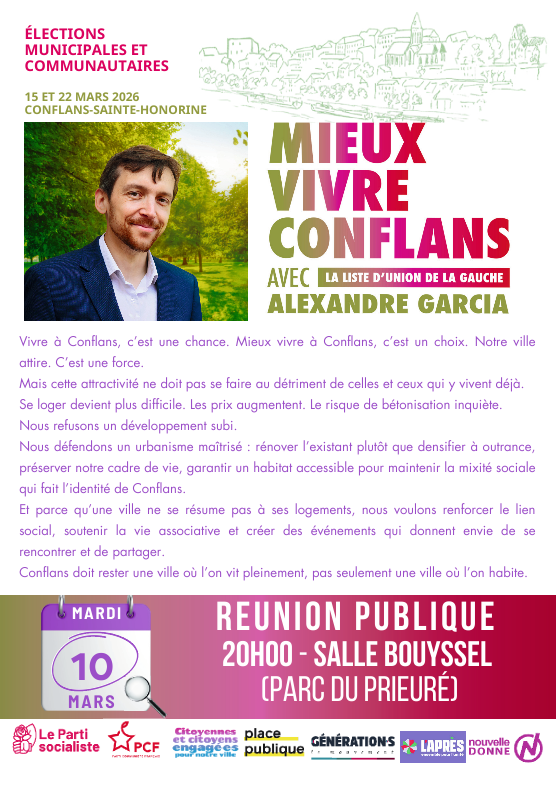 Vivre à Conflans, c’est une chance. Mieux vivre à Conflans, c’est un choix. Notre ville attire. C’est une force. Mais cette attractivité ne doit pas se faire au détriment de celles et ceux qui y vivent déjà. Se loger devient plus difficile. Les prix augmentent. Le risque de bétonisation inquiète. Nous refusons un développement subi. Nous défendons un urbanisme maîtrisé : rénover l’existant plutôt que densifier à outrance, préserver notre cadre de vie, garantir un habitat accessible pour maintenir la mixité sociale qui fait l’identité de Conflans. Et parce qu’une ville ne se résume pas à ses logements, nous voulons renforcer le lien social, soutenir la vie associative et créer des événements qui donnent envie de se rencontrer et de partager. Conflans doit rester une ville où l’on vit pleinement, pas seulement une ville où l’on habite.