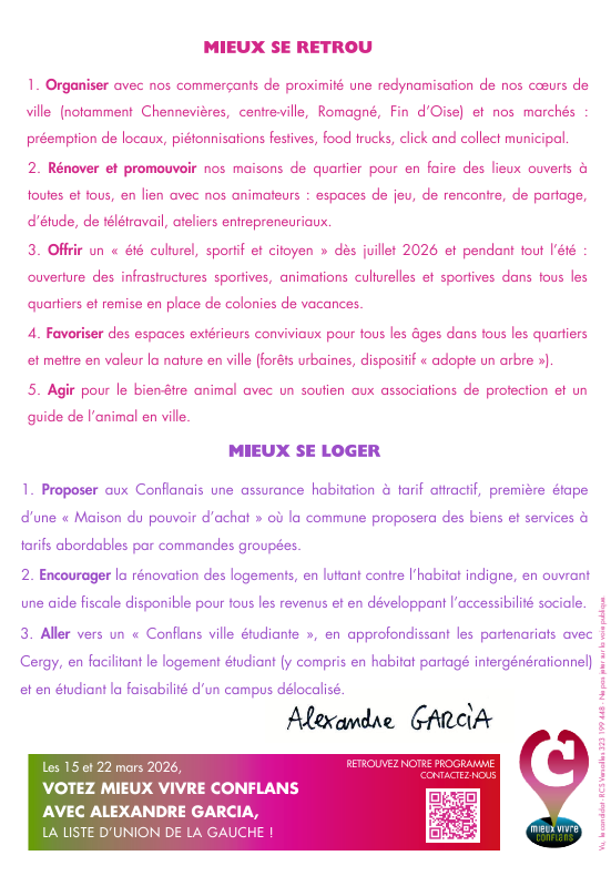MIEUX SE RETROUVER 1. Organiser avec nos commerçants de proximité une redynamisation de nos cœurs de ville (notamment Chennevières, centre-ville, Romagné, Fin d’Oise) et nos marchés : préemption de locaux, piétonnisations festives, food trucks, click and collect municipal. 2. Rénover et promouvoir nos maisons de quartier pour en faire des lieux ouverts à toutes et tous, en lien avec nos animateurs : espaces de jeu, de rencontre, de partage, d’étude, de télétravail, ateliers entrepreneuriaux. 3. Offrir un « été culturel, sportif et citoyen » dès juillet 2026 et pendant tout l’été : ouverture des infrastructures sportives, animations culturelles et sportives dans tous les quartiers et remise en place de colonies de vacances. 4. Favoriser des espaces extérieurs conviviaux pour tous les âges dans tous les quartiers et mettre en valeur la nature en ville (forêts urbaines, dispositif « adopte un arbre »). 5. Agir pour le bien-être animal avec un soutien aux associations de protection et un guide de l’animal en ville. MIEUX SE LOGER 1. Proposer aux Conflanais une assurance habitation à tarif attractif, première étape d’une « Maison du pouvoir d’achat » où la commune proposera des biens et services à tarifs abordables par commandes groupées. 2. Encourager la rénovation des logements, en luttant contre l’habitat indigne, en ouvrant une aide fiscale disponible pour tous les revenus et en développant l’accessibilité sociale. 3. Aller vers un « Conflans ville étudiante », en approfondissant les partenariats avec Cergy, en facilitant le logement étudiant (y compris en habitat partagé intergénérationnel) et en étudiant la faisabilité d’un campus délocalisé